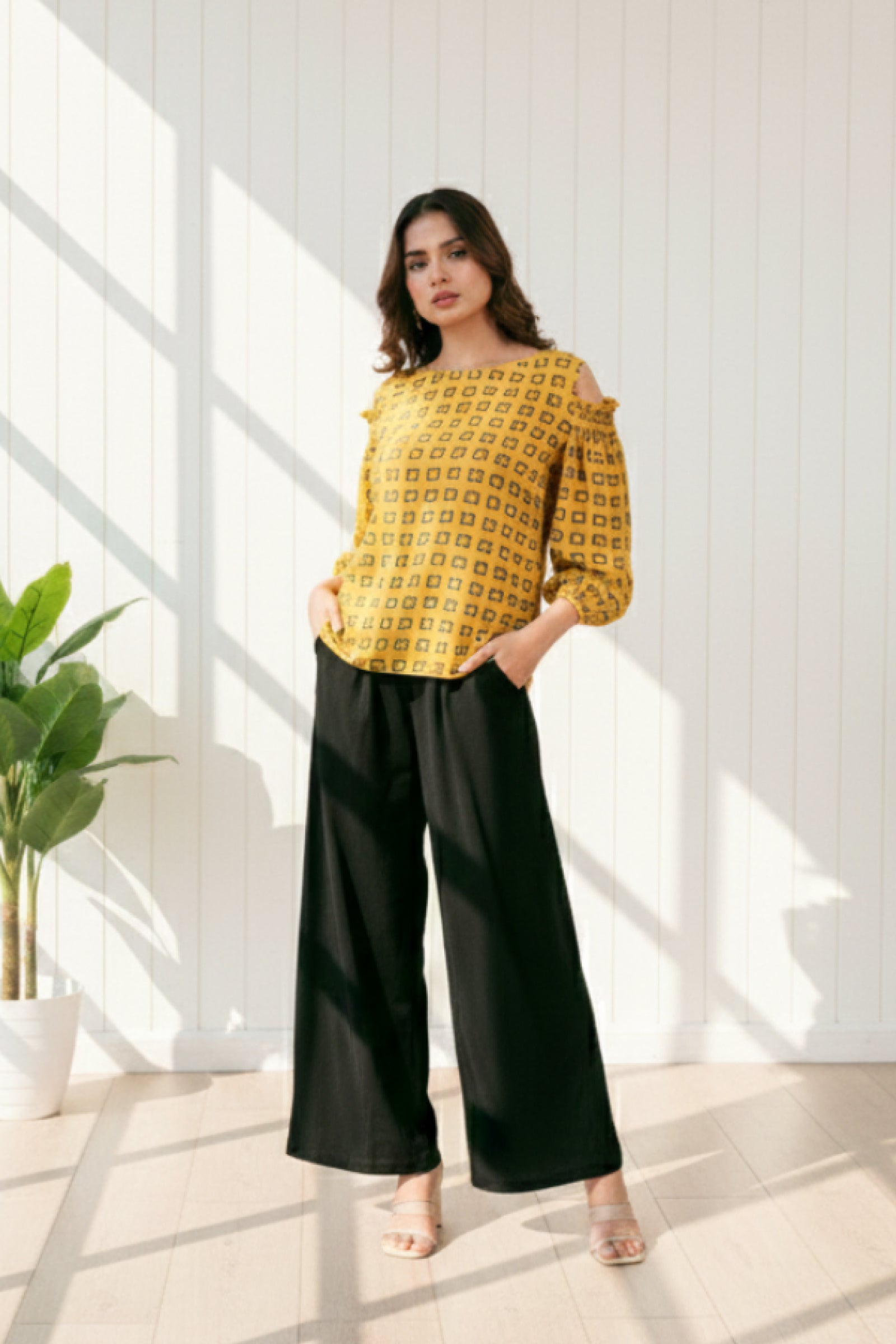 Turn heads with this feminine top in chiffon, featuring a loose fit and cut-off sleeves. Adorning prints on mustard add a vibrant touch to this short and flowy top, perfect for a chic and breezy look.